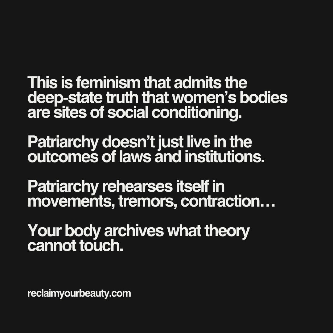 This is feminism that admits the deep-state truth that women’s bodies are sites of social conditioning. Patriarchy doesn’t just live in the outcomes of laws and institutions. Patriarchy rehearses itself in movements, tremors, contraction… Your body archives what theory cannot touch.